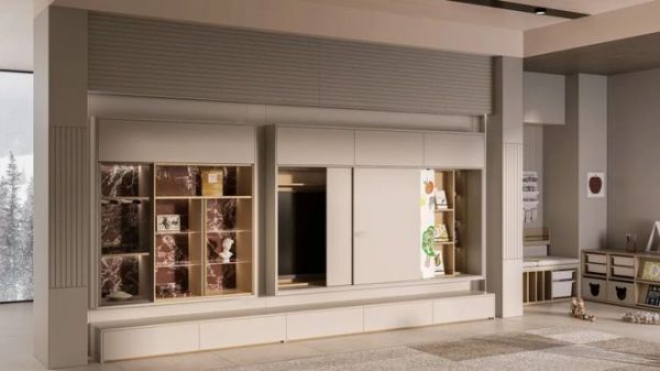 专为激发孩子想象力与创造力而设计,整合了涂鸦区、读物区与玩具收纳区。通过上翻书架、抽拉收纳篮、洞洞板墙面及定制靠背收纳等多重方式,巧妙解决育儿家庭玩具、书籍杂乱无章的痛点,让一切物品井然有序,让孩子在游戏中学习,在探索中成长。