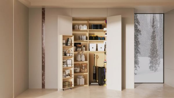 创新融入“800库”收纳理念,倡导物尽其用、定期清理,建立高效简洁的生活秩序。此设计能完美收纳玩具、行李箱、洗地机、婴儿车等大件物品,解决育儿用户物品繁多、存取不便的核心痛点。轮滑柜门设计巧妙节省空间,提升收纳效率;定制挂墙金属洞洞板充分利用垂直空间,提供多样挂件,灵活满足不同需求,让杂乱日常重归井然有序。
