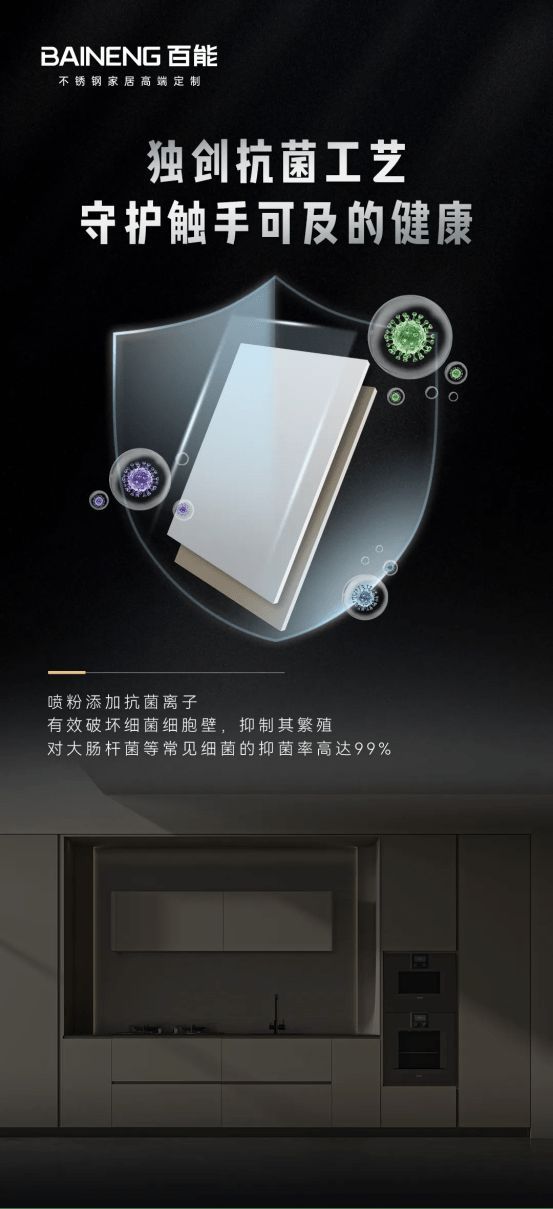 百能在门板表面喷粉中添加抗菌离子,这些抗菌离子形成一层致密的抗菌层,有效破坏细菌细胞壁,抑制其繁殖。经检测,对大肠杆菌等常见细菌的抑菌率高达99.99%,为您和家人的健康提供触手可及的日常守护。特别适合有宝宝和老人的家庭。