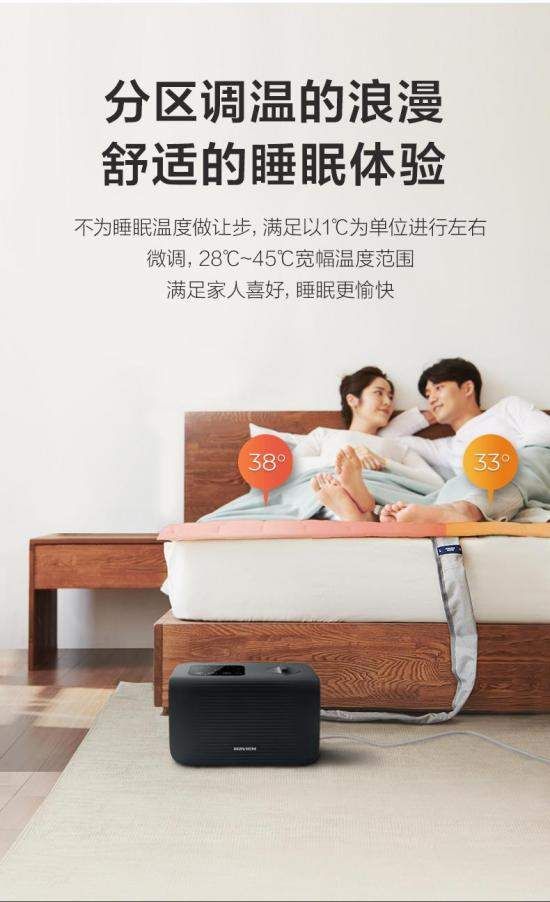 在舒适体验上,EQM580系列的实测表现堪称惊艳。该系列采用1mm创新超薄设计,铺在床上轻薄不压身,搭配高端环保材质,通过了肌肤刺激及细胞毒性测试,敏感肌也可安心使用。床垫内部铺设84m密集无软管水路,经实测,速热性能好,通电15分钟即可使床垫表面均匀升温至35℃,彻底解决导热不均的行业痛点。同时,其支持28-45℃宽幅调温,1℃精准控温,左右分区控温设计可满足双人不同需求,实测显示,夫妻双方分别设定33℃和38℃等不同温度的控制,两区域温度互不干扰,整夜恒温无波动。