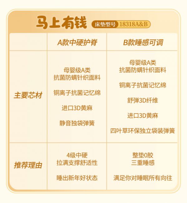 睡在吉言里,醒在好运中。“马上有钱”新品床垫已在全友家居全国门店上市销售,欢迎消费者前往线下门店咨询选购。