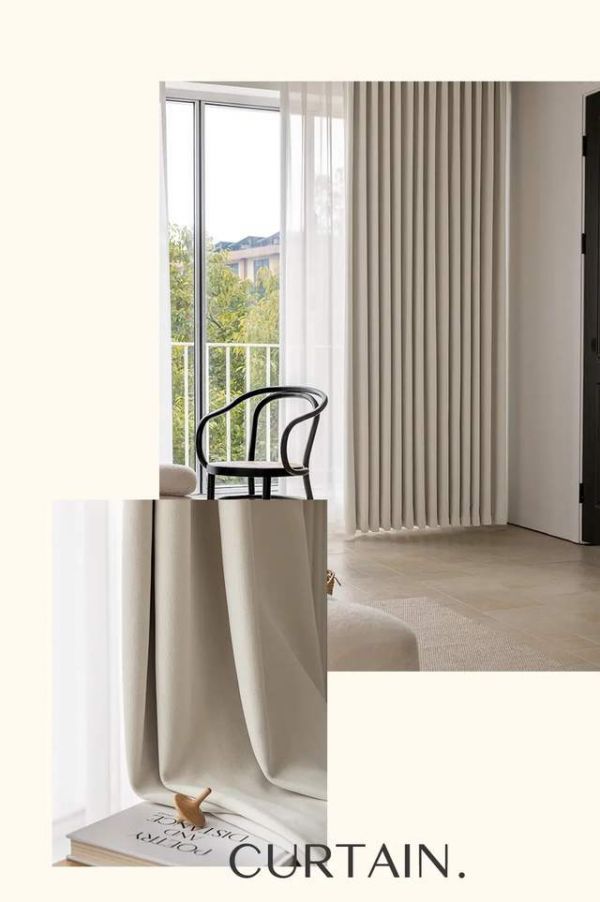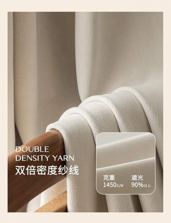 高支高密织造工艺,赋予面料无可置疑的厚重感与骨感,这不仅成就了视觉上的垂顺挺括,更带来了出色的遮光效果。目光所及,是温润饱满的绒感;指尖所触,是细腻扎实的质地。