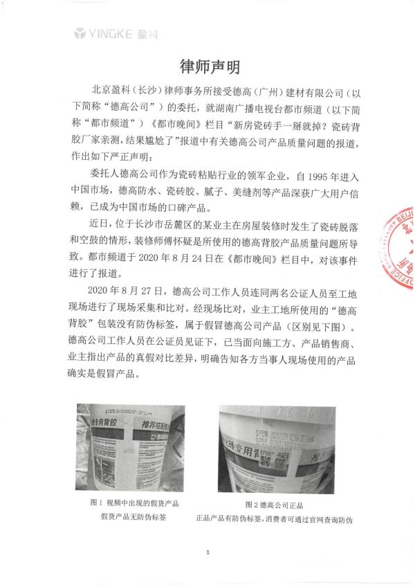 近日,个别媒体发布的不实报道《新房瓷砖手一掰就掉?瓷砖背胶厂家亲测,结果尴尬了》严重诋毁并损害德高公司的形象及品牌声誉。针对上述行为,德高公司保留采取一切法律行动的权利,坚决追究诋毁者的法律责任,我司现已委托北京盈科(长沙)律师事务所发布声明。