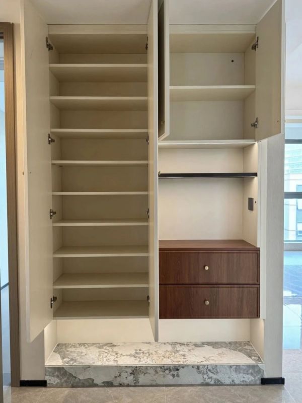底部铺设的潘多拉石材地台,进一步提升了空间的整体质感。鞋柜内部采用可灵活调节的活动隔板设计,能够轻松适配不同尺寸的鞋物,实现精细化收纳。