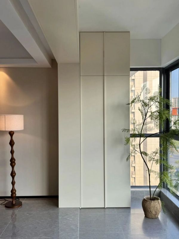 拆除了原有精装房的移门,采用意式奶冻木饰面包裹垭口,使阳台与客厅的衔接更为流畅自然。